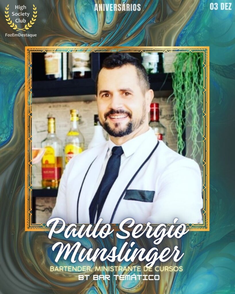 Bartender, Ministrante de Cursos – BT Bar Temático Paulo Sergio Munslinger é um renomado Bartender e Ministrante de Cursos, conhecido por seu trabalho à frente do BT Bar Temático. Sua expertise na coquetelaria e na arte de servir drinks o coloca como um profissional de destaque na gastronomia e eventos da região. É membro do HighSocietyClub FozEmDestaque.