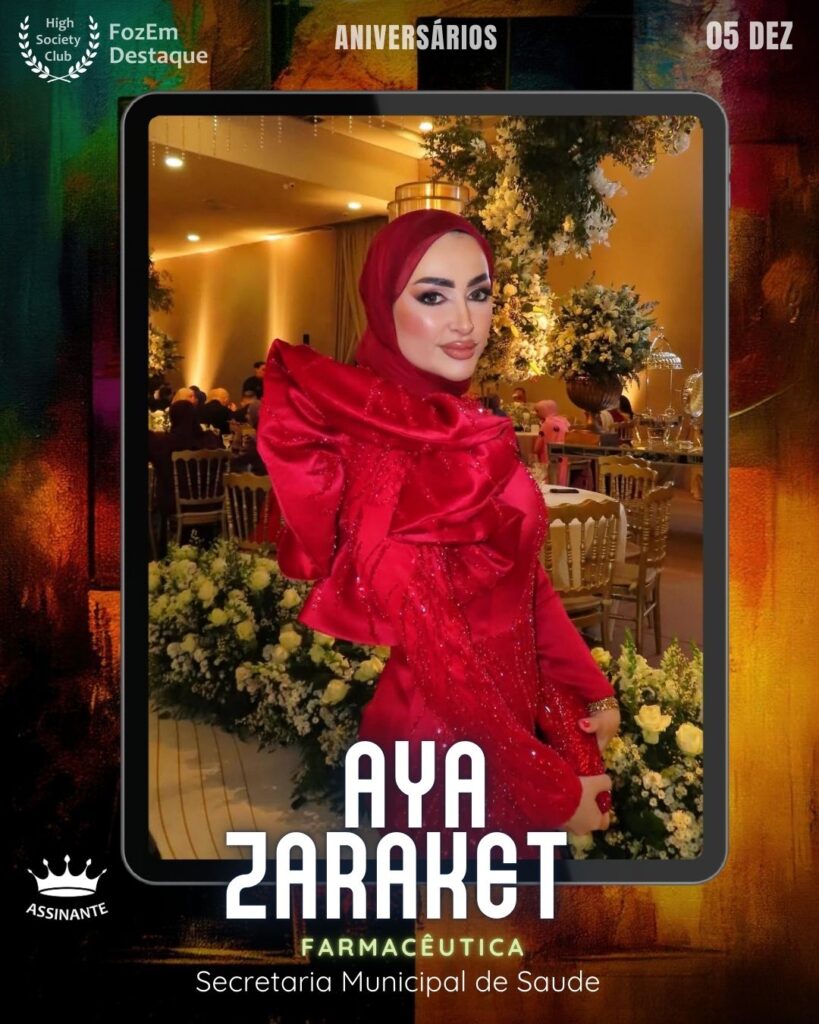 Aya Zaraket Farmacêutica dedicada e atuante, Aya Zaraket contribui diretamente para a saúde pública da cidade como profissional da Secretaria Municipal de Saúde. Seu trabalho é fundamental para garantir o bem-estar da população iguaçuense. É uma integrante ativa do HIGH SOCIETY CLUB. Portanto, Aya une a responsabilidade profissional à vida social de destaque.