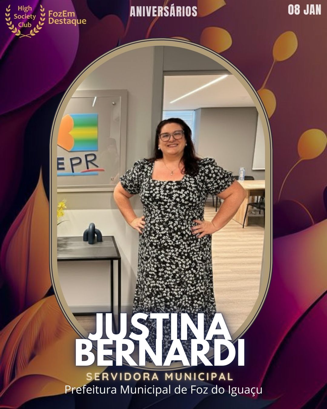 Servidora pública exemplar, Justina dedica seu trabalho à Prefeitura Municipal de Foz do Iguaçu. Sua trajetória é marcada pela eficiência e pelo compromisso com o desenvolvimento da nossa cidade. Membro honroso do HighSocietyClub. Instagram: justinabernardi Facebook: justina.bernardi