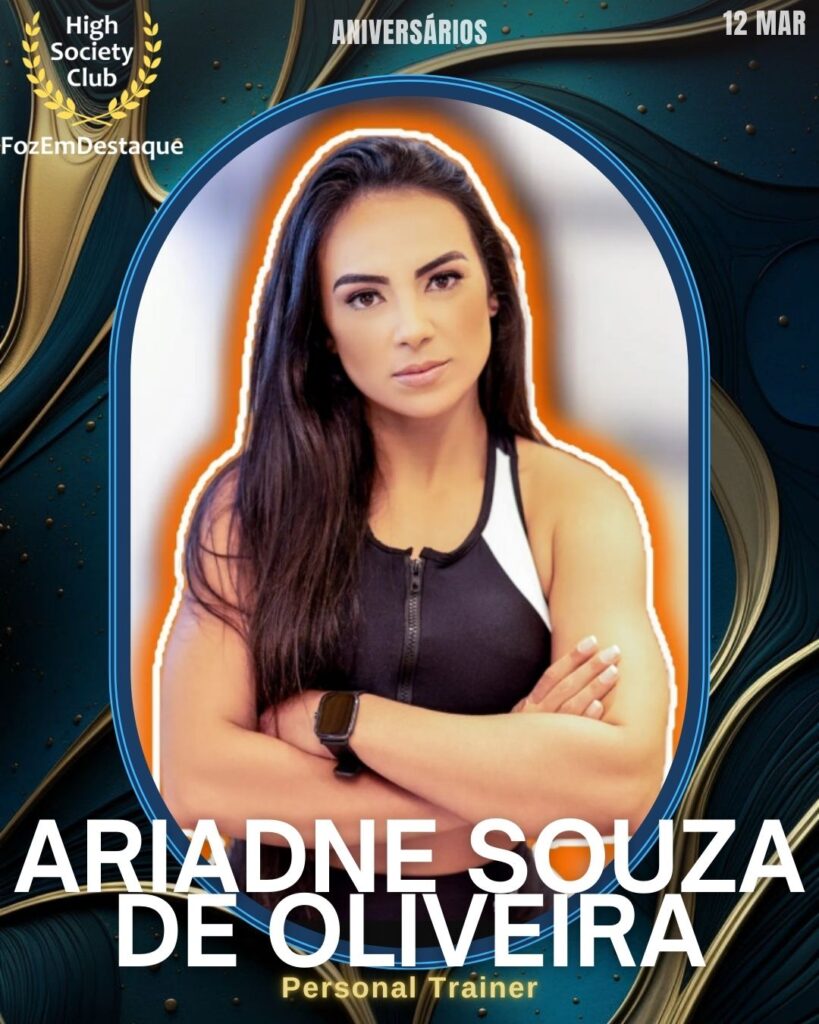 Referência em saúde e bem-estar, a Personal Trainer Ariadne Souza de Oliveira comemora mais um ano de vida. Com um trabalho focado em resultados e na qualidade de vida de seus alunos, Ariadne destaca-se pelo profissionalismo e pela energia contagiante que imprime em sua rotina. Membro do HighSocietyClub.