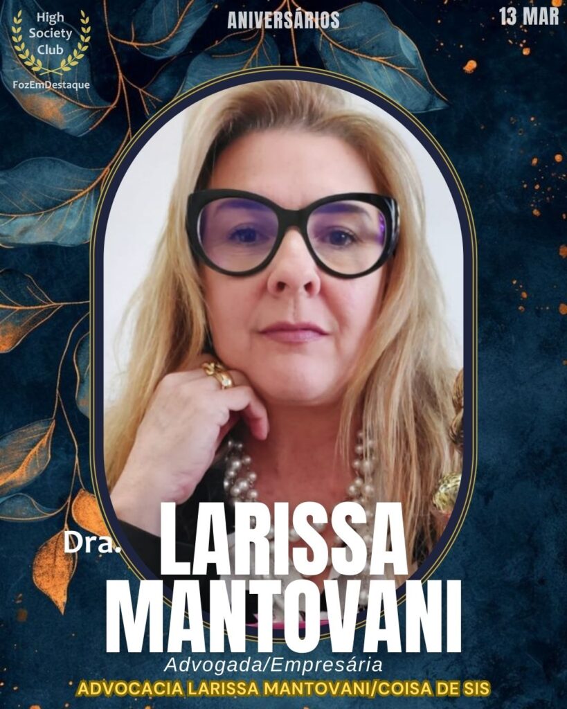 Unindo competência jurídica e tino empreendedor, a Dra. Larissa Mantovani destaca-se à frente de sua advocacia e do projeto “Coisa de Sis”. Sua atuação dinâmica e elegante é exemplo de versatilidade na fronteira, sempre conciliando a seriedade profissional com um estilo de vida inspirador. Que este aniversário traga ainda mais sucesso aos seus empreendimentos.