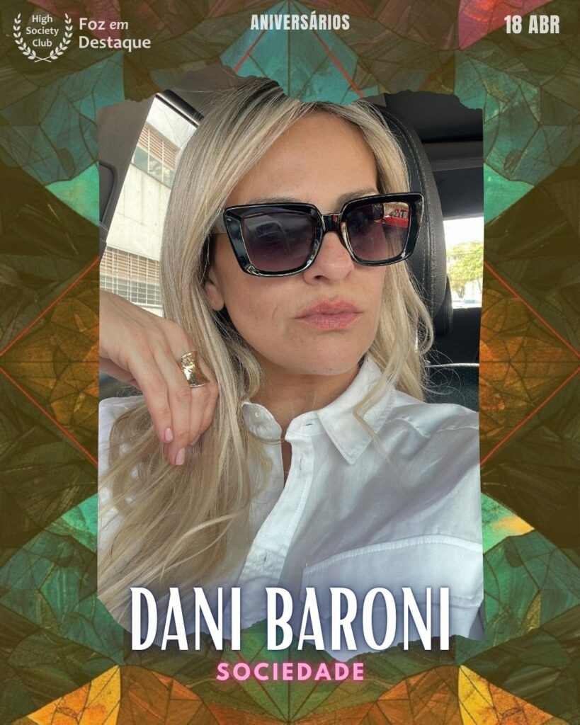 Presença confirmada nos eventos mais badalados, Dani Baroni é sinônimo de carisma e elegância social. Celebrar seu dia é garantir que a vida social de Foz do Iguaçu continue vibrante e conectada.