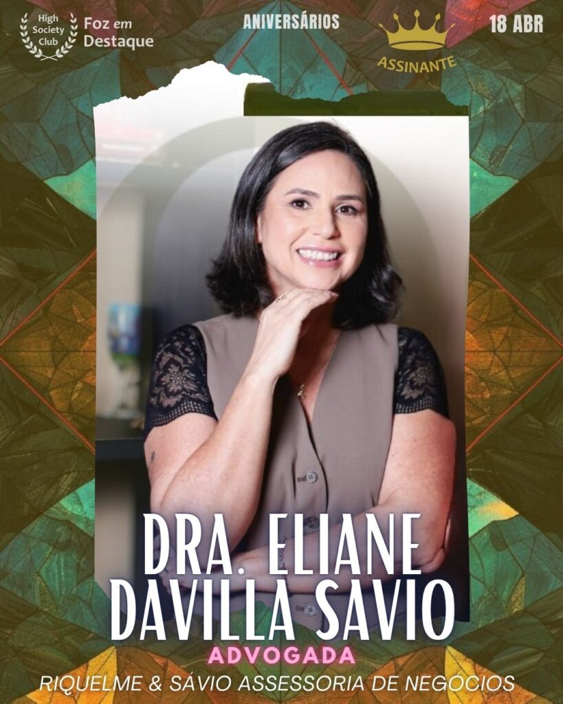Advogada de prestígio e Consultora de Negócios na Riquelme & Sávio, Dra. Eliane é Membro do HighSocietyClub. Sua trajetória em 2026 é marcada pela excelência jurídica e visão estratégica, consolidando sua influência na sociedade de Foz do Iguaçu.