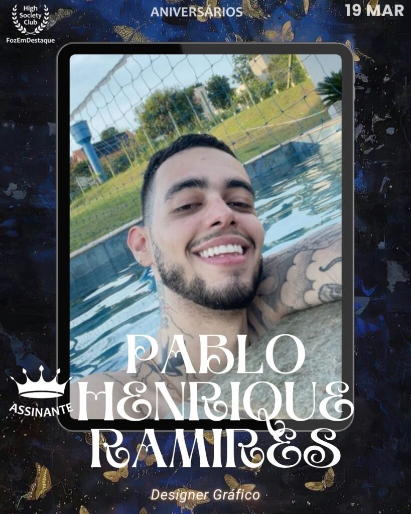 Membro do HighSocietyClub. Designer gráfico de mão cheia, Pablo Henrique Ramires é o talento criativo por trás de identidades visuais marcantes, incluindo seu trabalho na Diva Mag. Sua estética refinada e inovadora contribui diretamente para o padrão visual de alta qualidade do nosso clube.