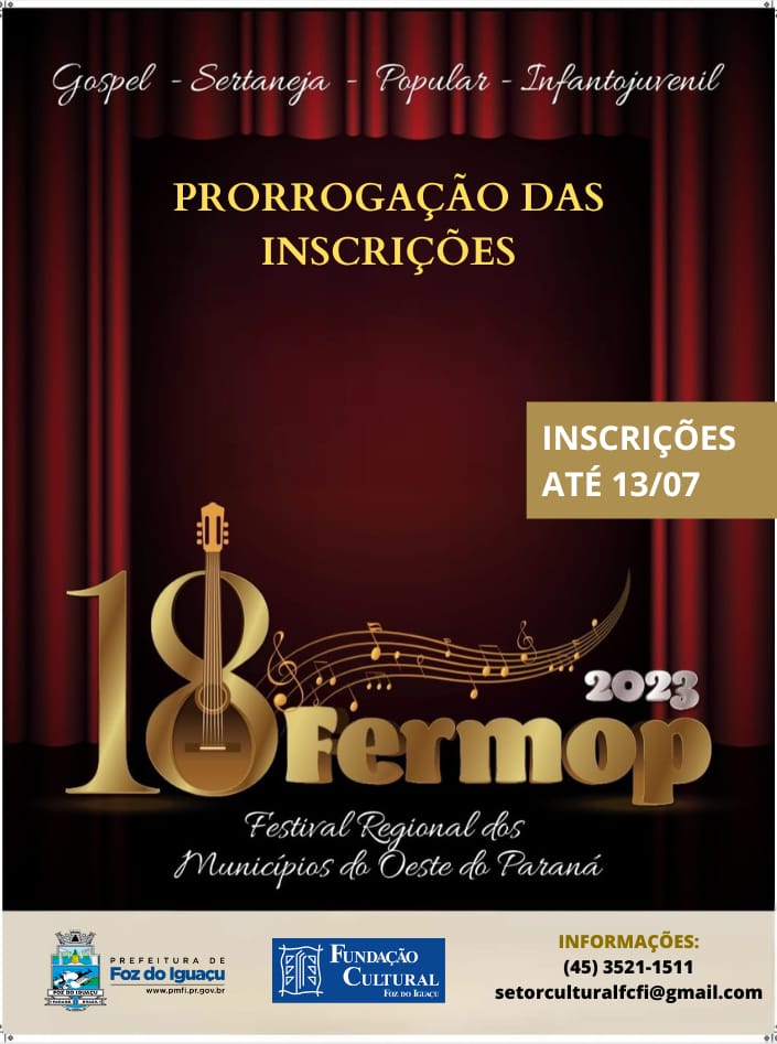 A Fundação Cultural de Foz do Iguaçu prorrogou o prazo de inscrições para a XVIII FERMOP – Festival Regional dos Municípios do Oeste do Paraná. Então, cantores locais terão até o dia 13 de julho para efetuar a inscrição nas categorias Popular, Sertanejo, Gospel ou Infanto juvenil.