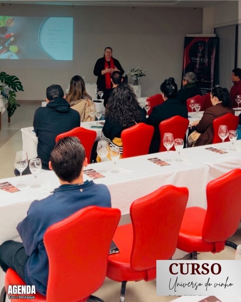 Com esta dinâmica, a sommelière internacional Janete Müller recebeu alunos e interessados em participar do Curso UNIVERSO DO VINHO, para uma sensacional aula magna, no Centro de Eventos do Hotel Plaza Foz.