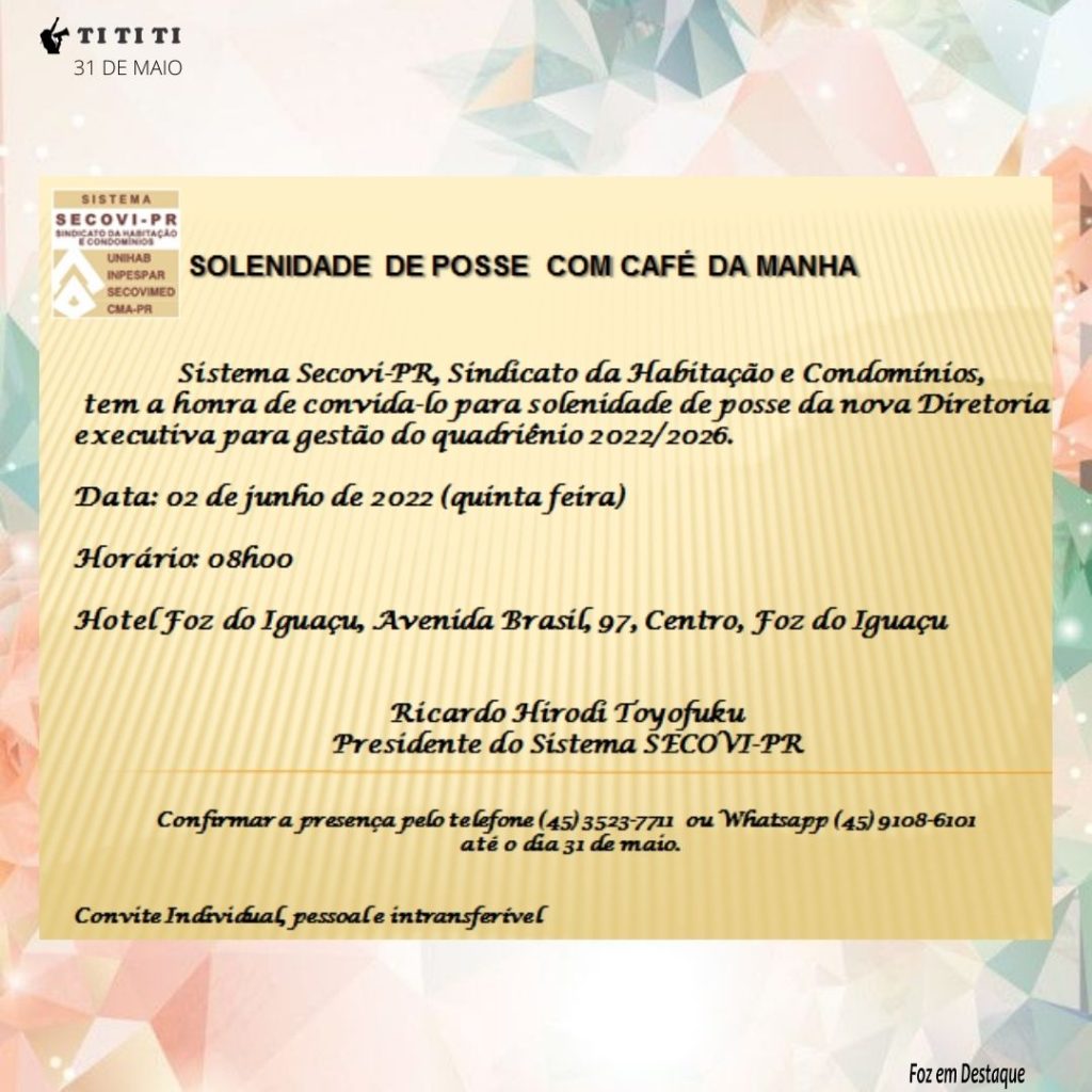 SECOVI PR Regional Oeste – Sindicato de Habitação e Condomínios, empossando nova diretoria na próxima quinta, 02 de Junho, durante café da manhã no Hotel Foz do Iguaçu.