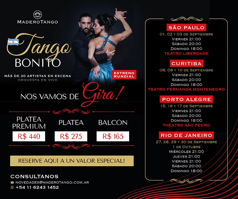 Madero Tango Iguazú, está saindo enfim, em sua primeira turnê internacional intitulada “Tango Bonito” pelo Brasil, em diversas cidades, em setembro.