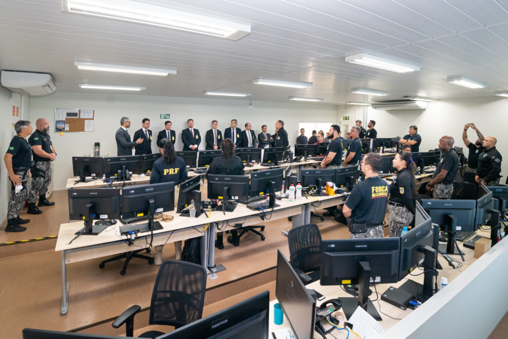Em seguida, o ministro participou de uma reunião fechada com integrantes da pasta e, logo após, foi até o CIOF para conhecer pessoalmente os diferentes ambientes ocupados pela estrutura, em especial a sala de controle, onde profissionais de diversas frentes trabalham juntos, cruzando informações recebidas de diversas fontes para combater ilícitos e capturar criminosos.