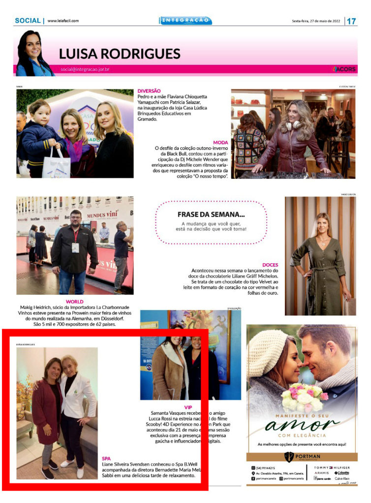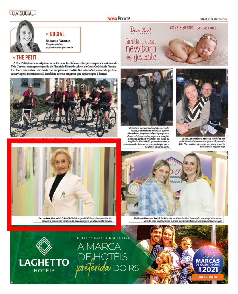 A empresária BERNADETTE MELZ SABBI (leia-se Rede B.WELL de ESPAÇOS de BEM ESTAR), sendo notícia na região de Gramado/RS.